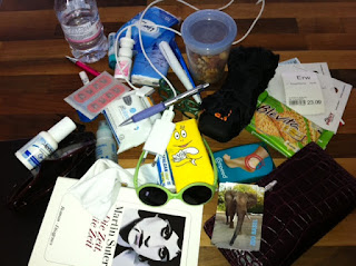 Für mich habe ich eingepackt: diverse Kugelschreiber, Handyladegerät, Regenschirm, Taschentücher, Sonnenbrille, ein Buch (!), mein Longchamp-Portemonnaie (Geschenk von meinem Mann inkl. passender Tasche, die ich gerade nicht verwende, aber über alles liebe), Blasenpflaster, Kopfschmerztabletten, Haarspange, Brillenputztuch mit Spray. Ausserdem entdeckt: Eintrittstickets für den Basler Zoo.