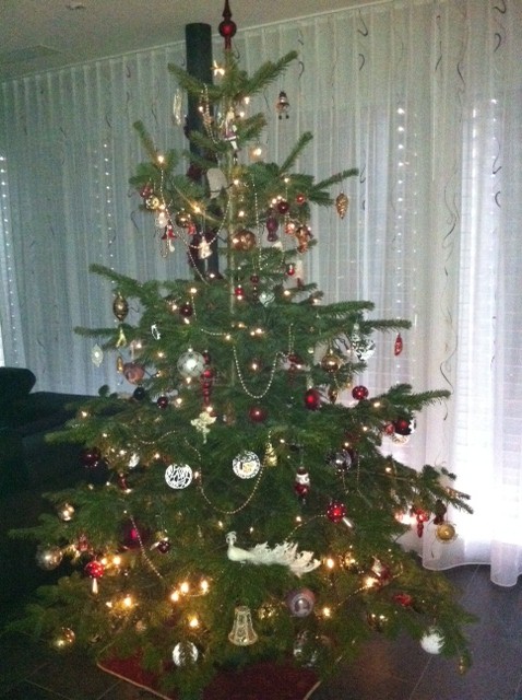 Bevor mein Mann um 1 Uhr morgens gebügelt hat, haben wir in anderthalb Stunden den Baum aufgestellt und geschmückt. Persönlicher Rekord! Früher (ohne Kind) ging dafür jeweils ein ganzer Nachmittag drauf! Begleitet von viel lauter Weihnachtsmusik und einem Gläschen Sekt. Mittlerweile machen wir „es“ leise und hastig, weil Zeit kostbar und meist nicht vorhanden ist. Hm. Hier also das Ergebnis: