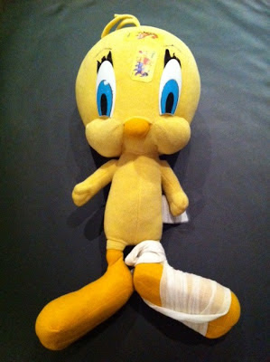 Gropipi ist leider im Spital. LadyGaga und ich haben daraufhin den Nachmittag damit verbracht, Tweety zu pflegen und zu verarzten: zwei Pflaster auf die Stirn kleben (LadyGaga: «Denn tuets nümme weh!»), Spritze geben («jetzt het er brüelet»), Bandage am Fuss anbringen («wie bim Papi), Fieber messen («drissig Grad!!»), Herztöne abhören («nei, är hueschtet nid!»), in die nicht vorhandenen Ohren schauen («isch guet»), Fingernägel schneiden («das muess sy»). Das volle Programm: