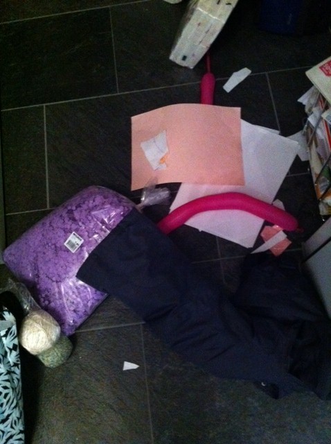 Confetti für Fasnacht morgen, Skihosen und Schlauchluftballons im Eingangsbereich |