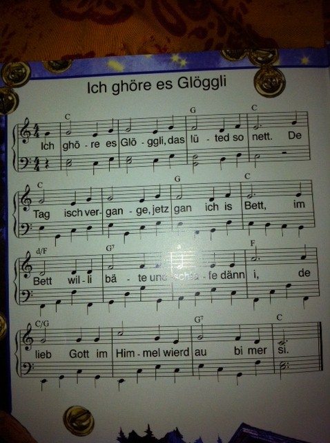 Abends. LadyGaga und ich singen inbrünstig Kinderlieder. Wir singen dieses bekannte Schweizer Zu-Bett-geh-Lied: